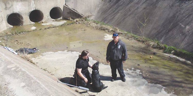 In late March, Animal Services Code Compliance officer David Davis responded to a request to help a dog that had fallen into a concrete channel. Davis found the dog trapped with its leash wrapped around a concrete block in a deep culvert. He called for backup officer assistance to aid in the rescue.